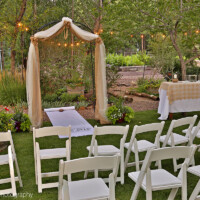 We have designed and built what is without question, the nicest facility in our community with your wedding in mind. The 2800 sq. ft structure features large, opening doors to take advantage of our reliable breezes, spacious window with a garden view, wrap around porches with seating, restrooms and a permanent bar. We also include a professional grade sound system inside the hall and in the outdoor ceremony area that is ready for either your DJ, or your digital music player and playlist to plug and play. A wireless microphone is also available for toasts and announcements. Included are 35 large rectangular banquet tables, smaller buffet tables, up to 100 fruitwood toned, wooden folding chairs with tan padded seats. Seating may be moved for ceremony and or garden seating. Bistro lights and strung LED emitters set a soft glow both within the hall and garden areas.